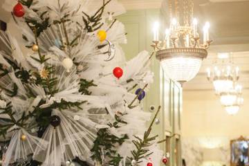 Дизайнерская ёлка представлена в отеле «Астория» в Петербурге. Она украшена множеством стеклянных игрушек, произведенных на заказ на фабрике венецианского стекла Signoretto Lampadari.