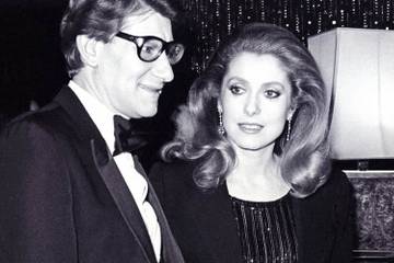 Денев познакомилась с Сен-Лораном, когда ей было 22 года (1965 год). Актриса по совету фотографа Дэвида Бэйла, за которым в тот момент была замужем, обратилась к преуспевающему дизайнеру за платьем для приема у королевы Великобритании Елизаветы II. Кутюрье создал для Денев платье из белого шелка с красной вставкой на груди. После этого Сен-Лоран неоднократно подбирал ей наряды для съемок.