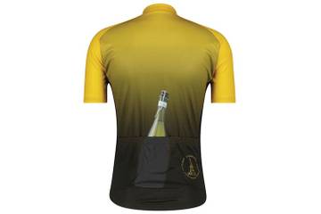 Отдельно стоит отметить желтую футболку с принтом в виде бутылки шампанского и логотипом команды Jumbo-Visma, которую спонсирует Hema.