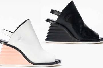 Ключевой элемент линейки — скошенная танкетка, которая плавно вырастает из подошвы, оставляя при этом пятку на весу. Она представлена в двух вариантах — с гладким покатым краем и со ступенчатым. Заху Хадид привлекала идея ступеней — ребристые силуэты спроектированных ею зданий говорят сами за себя, отмечает Vogue.