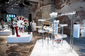 Коллекция была представлена в арт-пространстве в виде современной музейной инсталляции. Оригинальные объекты-модули, повторяющие основные элементы и паттерны, стали основой для демонстрации обуви, сумок и украшений.