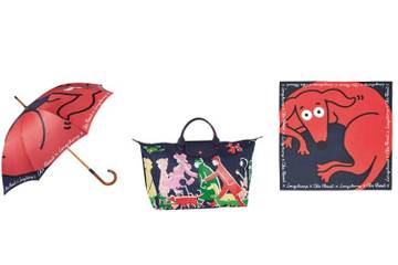 Главный принт капсулы - красная такса. Он нанесен на шелковый шарф и зонт, украшает кожаные аксессуары, а также брендовую упаковку и пакеты Longchamp.