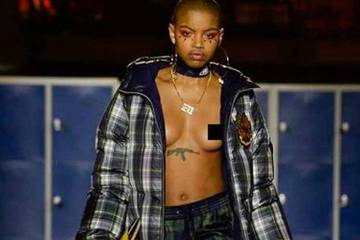 Девушки для показа были отобраны неформатные: татуировки, ирокезы, зеленые и розовые волосы, густо подведенные глаза и черные губы... Певица традиционно восстает против стереотипов.