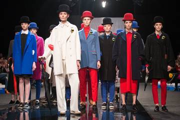 Коллекция построена на тенденции маскулинности. При этом, все выглядит очень элегантно и стильно: простые силуэты, яркие цвета, в отличие от предыдущего сезона. И главное, это, конечно, детали. Котелки и классические пальто, брюки - как широкие, так и узкие - и зонты-трости. Ну и глаза, вернее, ресницы.