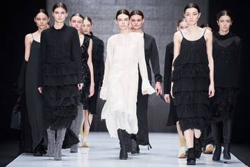 В осенне-зимнем сезоне концептуальный бренд I V K A одел девушек в фирменные бэби-доллы с королевскими подолами. Инфантильные платья, прозрачные, розовые, с трогательными рукавами в оборках, туфли, имитирующие ходьбу на цыпочках – это лишь основа для драматического контраста. Модели стремительно проходят по подиуму со скрещенными руками, глядят исподлобья. Дерзость и детскость сплетаются в белых цветах на черной сетке, в объемных рукавах из меха и перьев, пришитых к прямым лаконичным платьям.