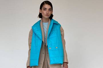 В коллекцию вошли плащи жемчужных оттенков и пальто, удлиненное стеганое и модель-трансформер с функциональными лямками, благодаря которым пальто можно носить как рюкзак. Тонкие утепленные жилеты контрастных оттенков - неоновый голубой и насыщенный синий - можно надевать под пальто и поверх него, создавая новые комбинации.