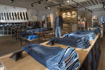 В оформлении магазина использован принцип единого архитектурного пространства, выполненного в урбанистичном стиле и создающего органичное восприятие женской и мужской линеек коллекции. Для внутреннего декора помещения дизайнеры решили использовать сочетание дерева, железа и камня — простых натуральных материалов, которые традиционно ассоциируются с джинсовой культурой.