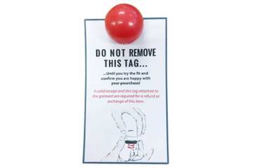 Бирка под названием R-Turn представляет собой красный шар, который крепится на видное место к передней части вещей, например, на воротник или карман. Ее можно легко снять, но прикрепить обратно уже не получится, и такая вещь не будет подлежать возврату.