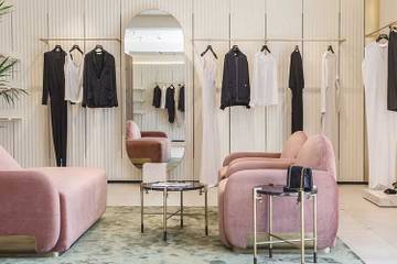 Интерьер магазина получился женственным и элегантным, пишет Vogue. Здесь и пудрово-розовая мягкая мебель, и обтекаемые формы без острых углов, и мягкий, рассеянный свет, и примерочные, напоминающие будуар.