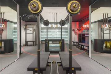 В пространство интегрированы инновационные детали из стали, черного и белого мрамора.На втором этаже представлены детали инновационного фитнес-зала Plein Sport — гимнастические брусья и кольца, скамьи для жима, боксерская груша, а также мотивирующие граффити и надписи на стенах.