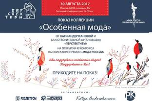 Одиннадцатый сезон конкурса на соискание премии «Мода России» - Russian Fashion Award откроет показ коллекции «Особенная мода» от Кати Андержановой и благотворительной организации «Перспективы» из Санкт-Петербурга при поддержке модельного агентства «PK management» из Москвы. Дизайнер Катя Андержанова, вдохновлённая картинами художников с инвалид...