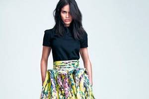 В капсульную линию входят женственные new look наряды, многослойные гофрированные юбки и топы, костюмы мужского кроя. Цвета яркие, цветочные принты присутствуют.