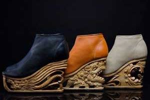 Туфли и ботильоны на деревянной платформе называются Dragon shoes. Процесс изготовления одной такой пары занимает 18 дней. Высота платформы достигает 10 сантиметров. Каждые туфли уникальны - рисунки на подошве не повторяются.