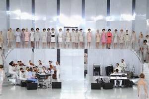 Показ кутюрной коллекции Chanel открыла Кара Делевинь в твидовых укороченном жакете и юбке и розовых беговых кроссовках. А завершилось шоу выходом невесты. Свадебное платье Chanel примерила все та же любимая муза Лагерфельда. К. Делевинь продемонстрировала прямое полупрозрачное платье серебристого оттенка с венком из перьев и все теми же кроссовками.