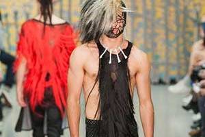 Sibling - остыл к одному-единственному снимку из фотокниги Дерека Риджерса 78-87 London Youth — портрет девушки с огромной черной гривой. Отсюда на подиуме маски с меховыми ирокезами, аппликации с длинным ворсом, седые пряди, вплетенные в сетчатые майки, красная бахрома.