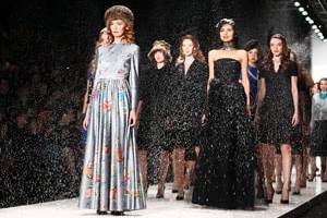 Одним из главных элементов дефиле стали горстки блестящего снега, которые модели кидали в воздух в финале дефиле.